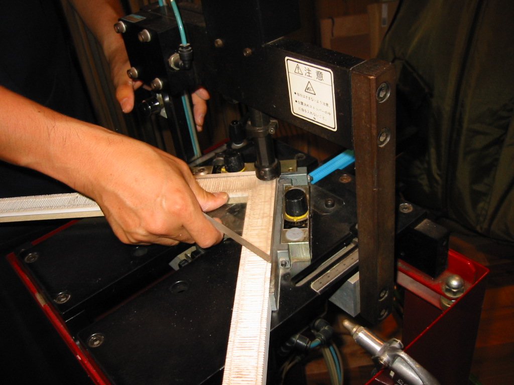 モールディング(棹縁)を組む機械。当店では、CASSESEというフランス製が活躍。圧縮空気で操作しコーナージョイント。工房併設の店内にて‘プシュン!”音とともに御覧にいれましょう。
