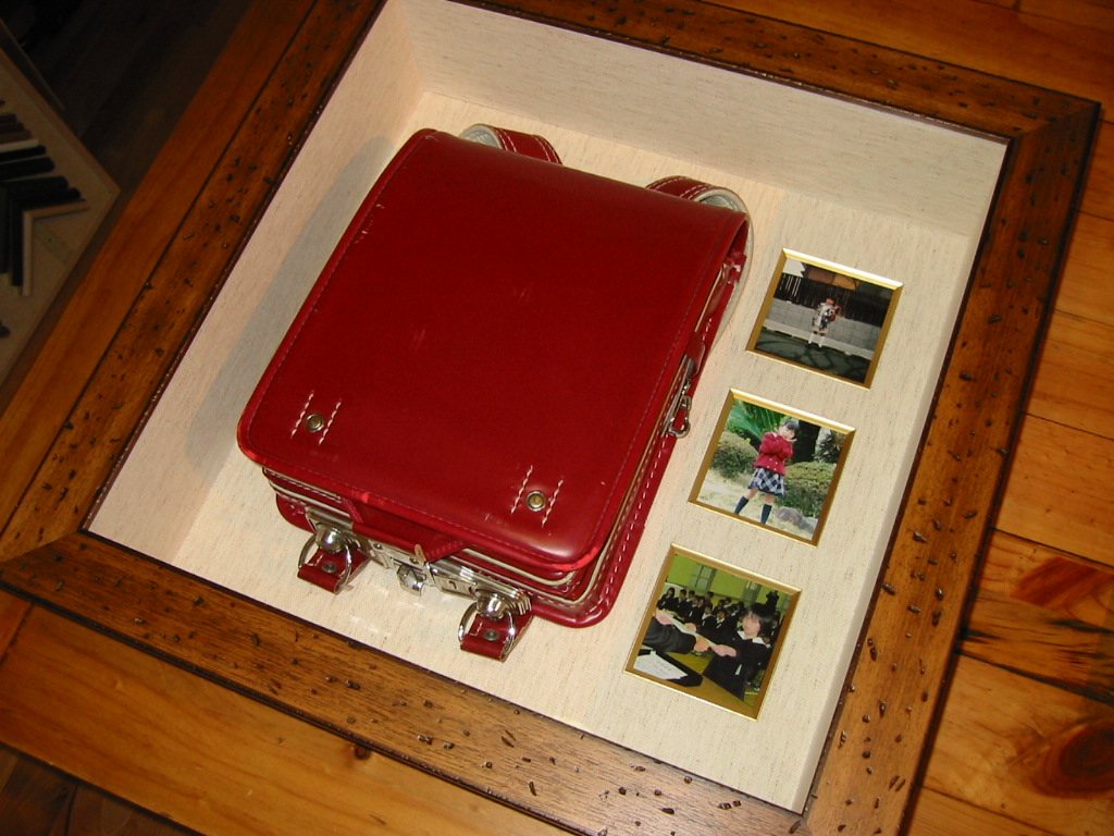 以前、ファーストシューズの額装をしたお客様。今年の春、その靴を履いていた娘さんは中学生に。6年間の思い出が詰まったランドセル。厚さなど、工夫をして額装いたしました。大切な宝物から、温かい素敵な気持ちが伝わってきます。