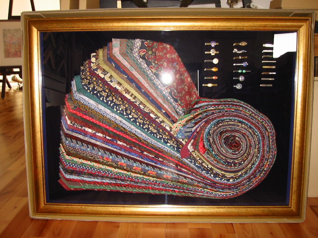 営業の仕事一筋だった亡きご主人の思い出を額装。大変おしゃれな方だったそうで、これはまだ、ほんの一部。とはいえ46本のネクタイと21点のネクタイピン。一つの額縁に収めるため、あまり大きくなり過ぎないように工夫。本日、お渡しし、大変喜んでいただきました。