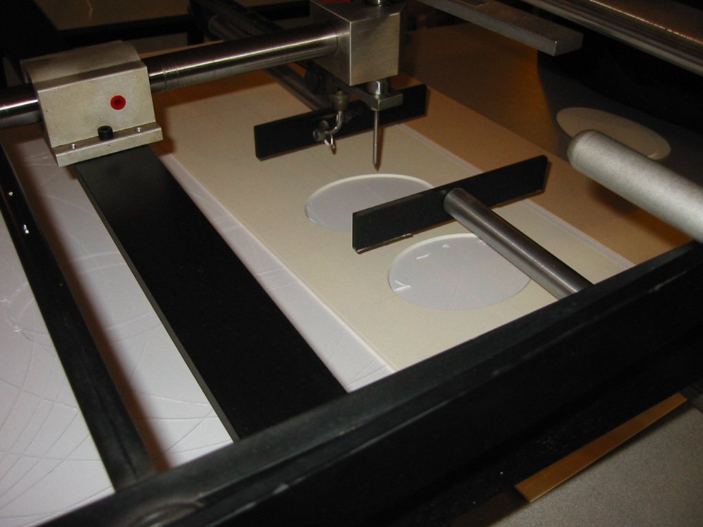 手動式アメリカ製のサークルマットカッター。マットボードを円や楕円に、大きさも様々に抜く機械。また、最近ではコンピューターマットカッターによりフリーハンド形にも抜くことができるので、ぜひご相談ください。