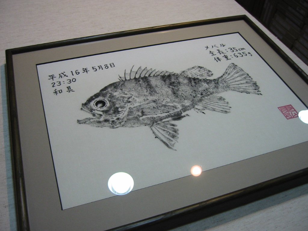 釣りが趣味の友人。魚拓の額装は4枚目。ますます腕をみがき・・つれた詳しい場所はナイショだと。