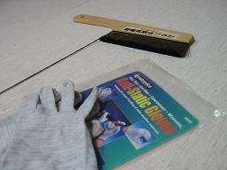 額装の作業においては、冬場のみならず一年中、静電気除去は大切なこと。アクリル板を扱う場合には特に気をつける。帯電防止剤・放電ブラシ・静電気除去手袋が活躍している。