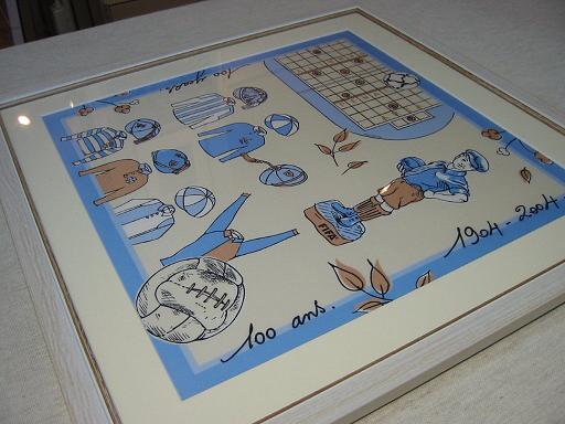 1904年にチューリッヒにて創立されたFIFA(国際サッカー連盟)。2004年に創立100年を迎えた記念のスカーフの額装依頼。アイボリーとブルーの色に額やマットの色調もあわせたコーディネート。さわやかな仕上げに喜んでいただきました。