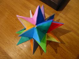 年に一度、小学校での学習成果を子供たちが各クラスでさまざまなゲームや体験コーナーを企画発表する祭り(文化祭のようなもの)がある。今年もその日が近づき、その来客参加者への賞品がこれなのだそうだ。部品30個をおりがみで折りつくって組み合わせるという、結構手の込んだもの。毎年なんらかの多面体オリガミを製作する意外な彼の集中力にビックリ。