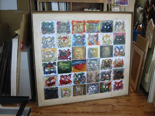 奥野さんの今度の個展での展示作品の一つ。イタリア製のモールデリングで1250mmx1400mmの大きなサイズの額装をいたしました。一つ一つ違う味わいのシーサーが36匹。それぞれを描いたときのシチュエーションのお話はぜひ画廊にてご本人からどうぞ。
